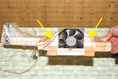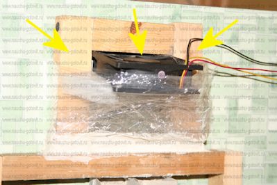 крепление под обычный компьютерный вентилятор, снаружи обмотал пищевой пленкой, щели замазал герметиком,